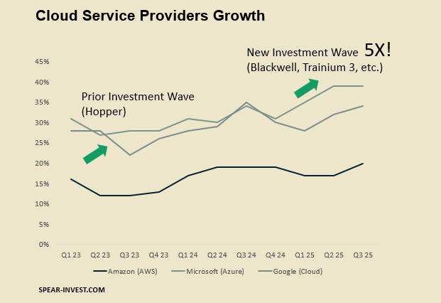 Every hyperscaler (Azure, AWS, Google, Meta) reported accelerating capex growth this quarter. While market reactions were mixed — Amazon and Google outperformed; Microsoft and Meta lagged — the common denominator was clear: spending is up and demand still exceeds supply.